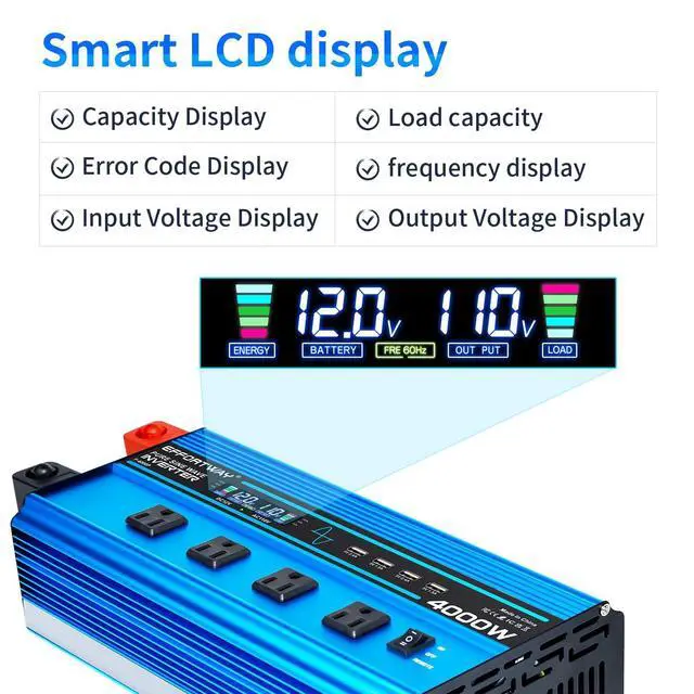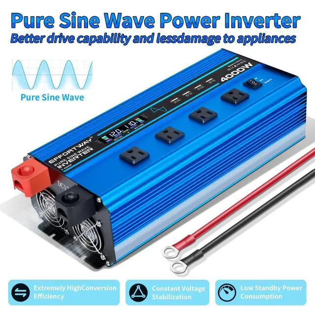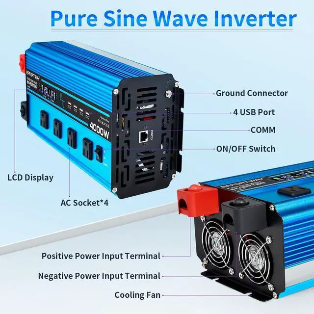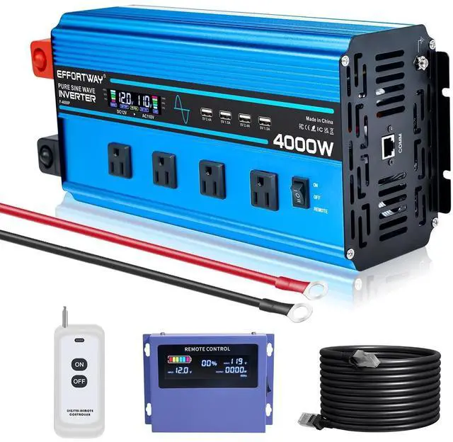 Pure Sine Wave Inverter: Provides stable 4000W continuous power and 8000W peak power to easily convert power from DC 12V to AC 110V/120V 60HZ. with more efficient conversion rate (>90%) to ensure reliable performance for outdoor adventures, camping and trucking use ^^ Remote control and