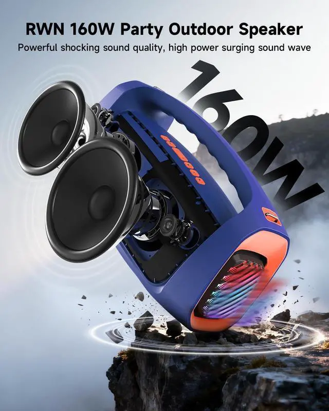 OUTDOOR SOUND: This portable speaker is equipped with two 3.5 -inch 60W woofers and two 20W tweeters. DSP Intelligent Crossover technology adds depth and clarity to the sound. With up to 160 W, it's easy to navigate backyard parties and movie Night. ^^ IP67 FULL PROTECTIONBuilt for outdoor adventures, this waterproof speaker shrugs off pool splashes, pumps your favorite tunes through hike rainshowers, and stays with you always.