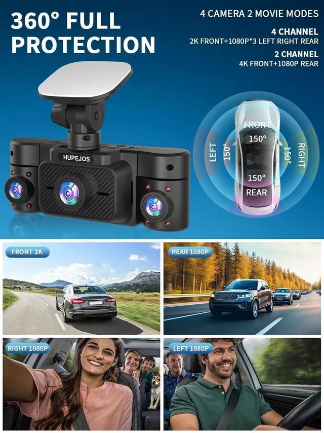 4 Channel 360 Dash CamHUPEJOS V50-4CH Mini Dash Cam will provide you with 150*4 super wide-angle field of view, left and right cameras can be rotated to adjust the angle to ensure 360 all-around protection. Which offering 2 movie modes: 4K front + 1080P rear, or 2K front + 1080Px3 left, right and rear resolutions. The left and right lens shots are stitched together into a single frame for easy viewing. The excellent resolution of the dash cam front and rear seamlessly captures every detail
