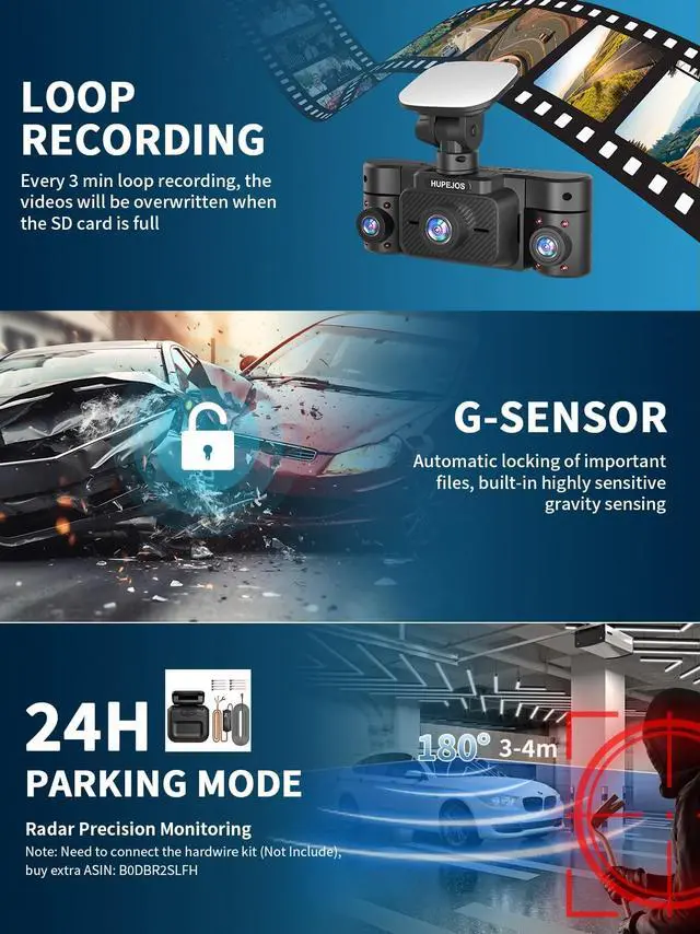 Loop Recording & G-Sensor DashcamThe driving recorder comes with a 64GB SD card (maximum support 256GB). Every 3min loop recording, the oldest videos will be overwritten when the SD card is full. Built-in sensitivity G-sensor can automatically detects a sudden shake/collision and locks the footage to prevent the video from being overwrote even in loop recording
