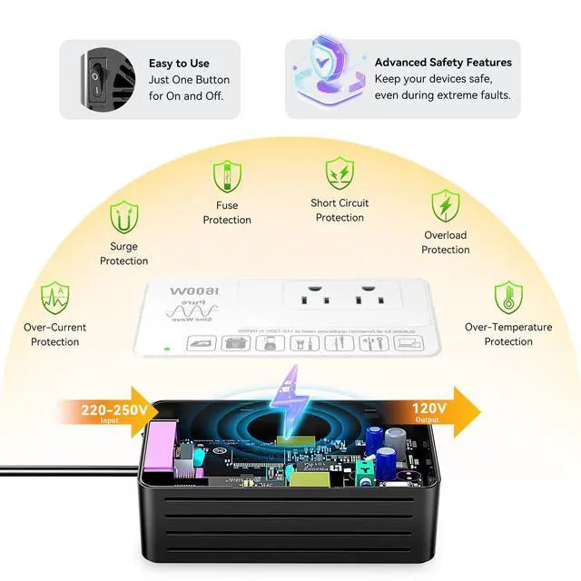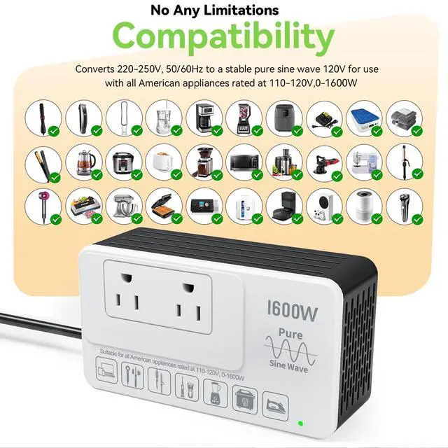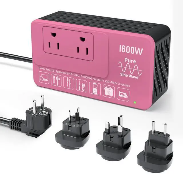 Eleclead 1600W Pure Sine Wave 220V to 110V Voltage ConverterEasily convert 220250V to a stable 120V pure sine waveideal for safely using U. S. appliances (110120V, up to 1600W) while traveling abroad. Comes with 4 international plug adapters for use in 160+ countries. Built-in advanced safety protections and smart fault detection ensure long-lasting reliability. No fuse replacement needed. Compact, powerful, and backed by a 2-year warranty.