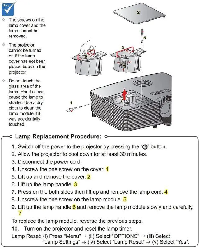 Projector models: for JVC DLA-RS400 DLA-RS400U DLA-RS420 DLA-RS440K DLA-RS440U DLA-RS500 DLA-RS500U DLA-RS520 DLA-RS540K DLA-RS600 DLA-RS620 DLA-RS640K DLA-X5000 DLA-X5000BE DLA-X5500 DLA-X550R DLA-X570 DLA-X5900 DLA-X5900BE DLA-X5900WE DLA-X590R DLA-X7000 DLA-X7500 DLA-X750R DLA-X770 DLA-X7900BE DLA-X7900WE DLA-X790R DLA-X9000 DLA-X9500 DLA-X950R DLA-X970 DLA-X9900BE DLA-X990R PK-L2615UGInstalling a Projector LampTo install a projector lamp with the housing, just follow the easy steps below: 1. Make sure the projector is unplugged and sitting on a flat surface2. Loosen the screw holding the projector lamp module cover in place and remove the panel3. Unplug the old projector lamp and remove it from the projector4. Plug the new projector lamp securely into place5. Attach the panel back onto the projector and tighten the screw