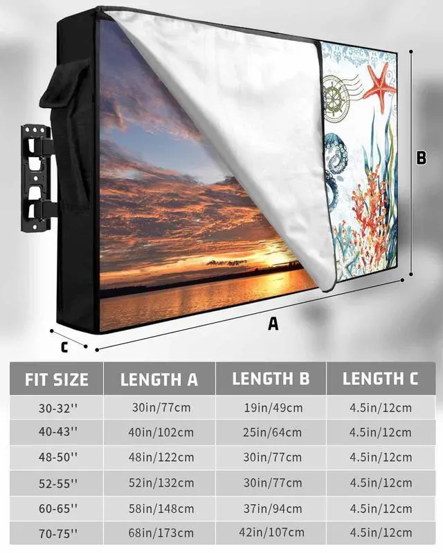 Cover Size: 30"x19"x 4.5" = 77x49x12 cm fit for 30 - 32 inch TV40"x25"x 4.5" = 102x64x12 cm fit for 40 - 43 inch TV48"x30"x 4.5" = 122x77x12 cm fit for 48 - 50 inch TV52"x30"x 4.5" = 132x77x12 cm fit for 52 - 55 inch TV58"x37"x 4.5" = 148x94x12 cm fit for 60 - 65 inch TV68"x42"x 4.5" = 173x107x12 cm fit for 70 - 75 inch