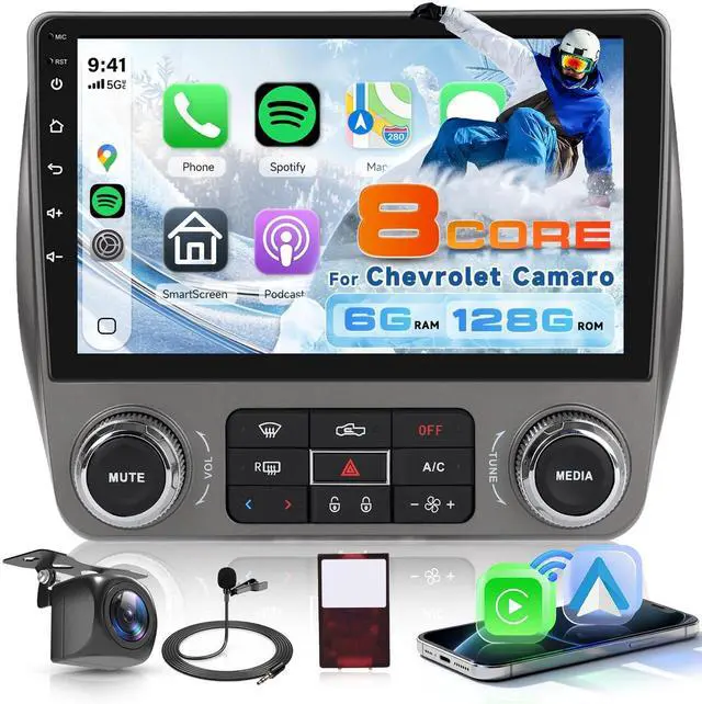 Inch Upgrade: The radio for Chevrolet Camaro features an 8-core Android 15 system, 6GB RAM, and 128GB storagedelivering fast, lag-free performance and access to millions of apps. Its 9 inch (1280*720) touch screen offers crisp visuals and responsive controls, making operation smooth and intuitive. This car play for Chevrolet Camaro blends top-tier hardware and software, upgrading older vehicle dashboards with a powerful, user-friendly in-car hub. ^^ Wireless Connectivity- CarPlay, Android Auto &