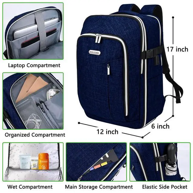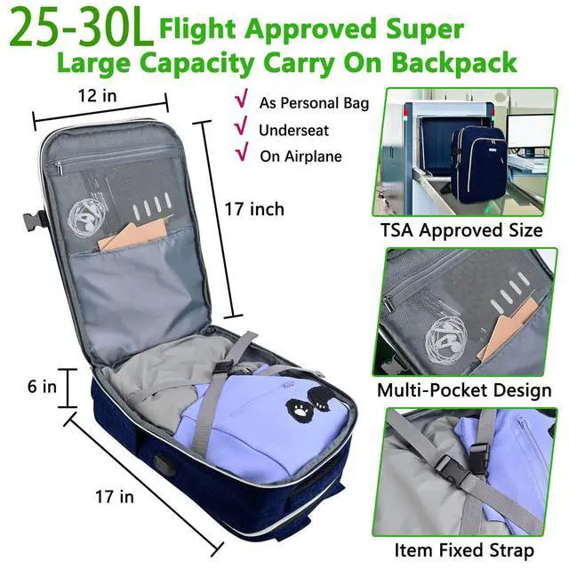 Separate Organized Pockets: 1*seperate padded laptop compartment for 13-17 inch laptop; 1*large main compartment to hold books, cloth, 2-3 days travel essentials; 1* front wet compartment to store wet items; 1*front zipper compartment for small items; 1*anti-theft back pocket for valuables; 2* side pouch for water bottle, umbrella. ^^ Airline Approved & Personal Item Size: External dimensions are 16.911. 86.1 inches (HWD), 1.87 lbs weight and 25L volum. Fits standard of PERSONAL ITEM 18x14x8 inch. (manual measurement, for reference only, subject to actual measurement). It fits underneath find as well as overhead cabin.