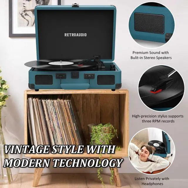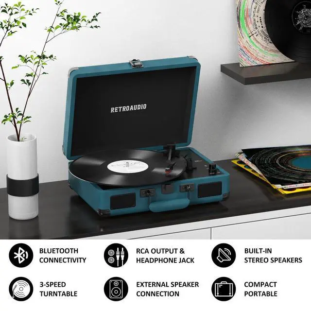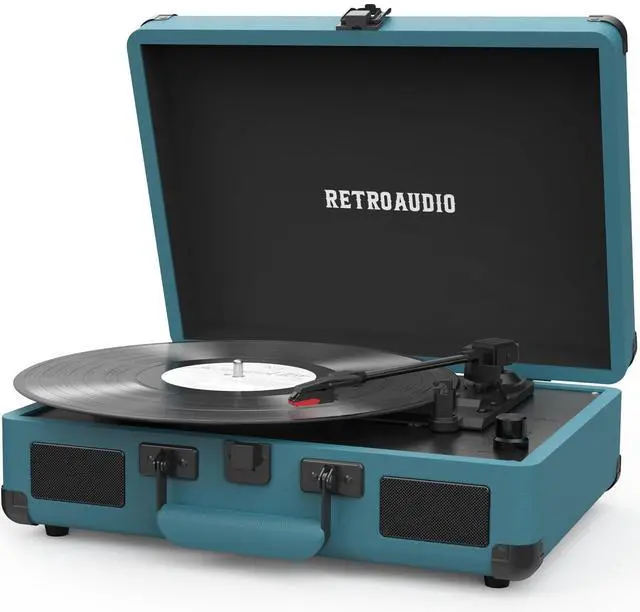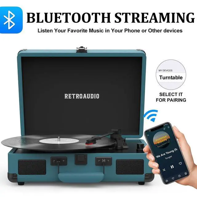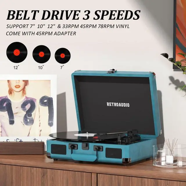 3-Speed and 3 Sizes TurntableSupport 33 1/3, 45, 78RPM and 7", 10", 12" Vinyl. Equipped with a reinforced turntable and sound-isolating feet, it can effectively prevent the vibration caused by playback and restore the most authentic music for you. ^^ Retro Suitcase Record PlayerThe combination of retro elements and modern craft design. Turntable in a vintage suitcase with a convenient carrying handle, allowing you to listen to your music anytime, anywhere, the way you want. ^^ Bluetooth Input PairingEasily Pair and play music from all your favorite devices like iPhone and Android smartphones, tablets through the turntables built in speakers using Bluetooth.