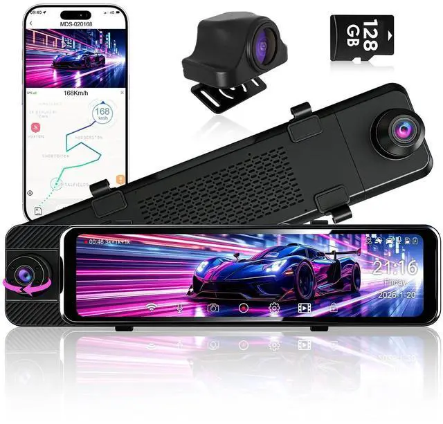 The built-in camera is rotatable for multi-angle recording inside, outside, and around the vehicle. Paired with a 128G memory card, it supports long-time recording. ^^ 24H Parking Monitor & Reverse AssistThis 3 Channel Mirror Dash Cam supports 24-hour parking monitoring. We provide a power cable and 128G memory card for free, with no extra cost. It supports continuous 24-hour recording and G-sensor function. The backup camera also offers reverse assist, helping you park accurately and ensuring your driving safety. ^^ Built-in 5G WiFi & APP SupportThis rear view mirror camera has built-in 5G WiFi, allowing remote video recording and control via the APP.