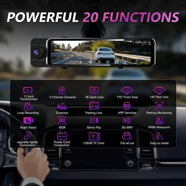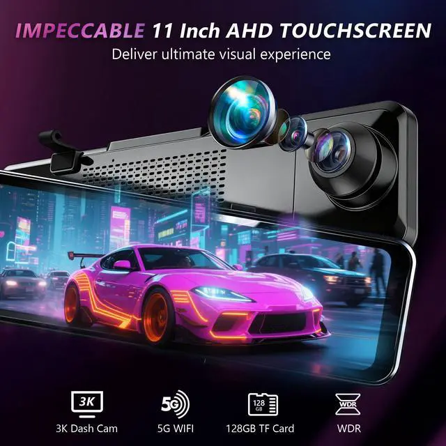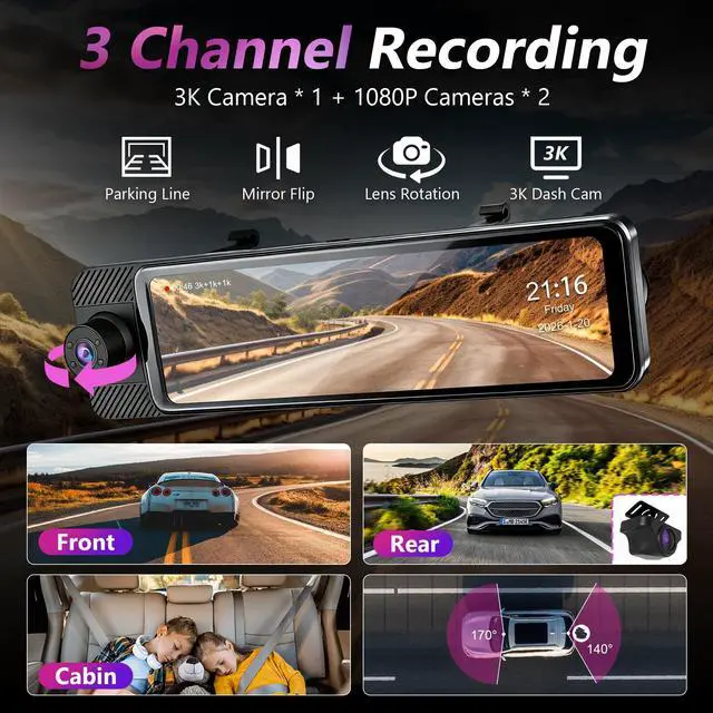3 Channel Mirror Dash CamThis triple Rear View Mirror Camera includes front, in-cabin, and rear cameras. The front camera records in ultra-clear 3K, while the other two support 1080P FHD. It offers a 170 front wide-angle and 140 rear wide-angle, fully covering multiple lanes. It clearly captures front license plates and records every detail of your trip perfectly. ^^ 11-Inch AHD IPS TouchscreenThis rear view mirror dash cam have 11-inch HD IPS touchscreen with 2.5D glass clearly displays all camera footage. It supports easy switching between three cameras and screen mirror flip.