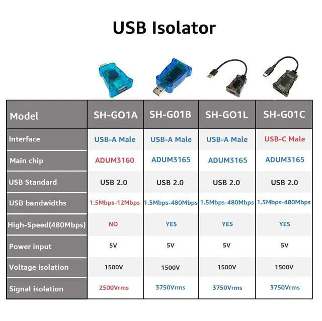 The SH-G01B USB Isolator is built with ADI's ADUM3165 chip. It supports USB 2.0 high speed mode with maximum transfer speed up to 480Mbps. It protects USB ports from surges and voltage spikes, eliminates noise introduced by ground loops, and supports most operating systems.
