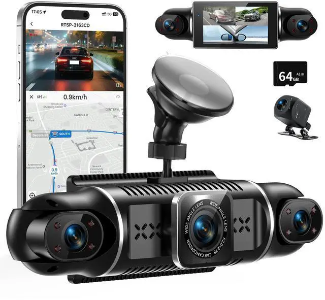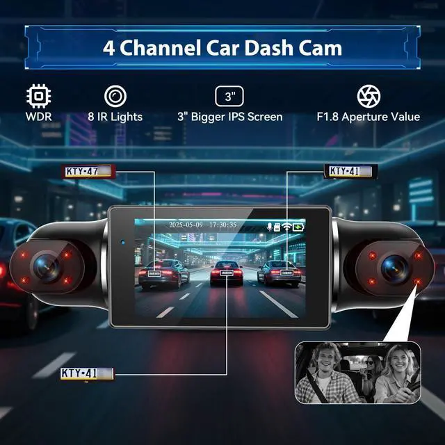 4 Channel 360 Panoramic ViewThis dash cam is equipped with four onboard cameras, which can simultaneously capture multi-angle images from the front, rear, left, and right. The left and right cameras can be rotated 180 to record in real time through the side windows, providing a comprehensive 360 view that eliminates blind spots around the vehicle. It is ideal for recording side collisions, lane changes, and parking accidents in complex traffic environments. ^^ FHD 4K+3 *1080PThe dash cam front and rear, front 4K camera offers ultra-high definition, clearly capturing road signs and license plates.