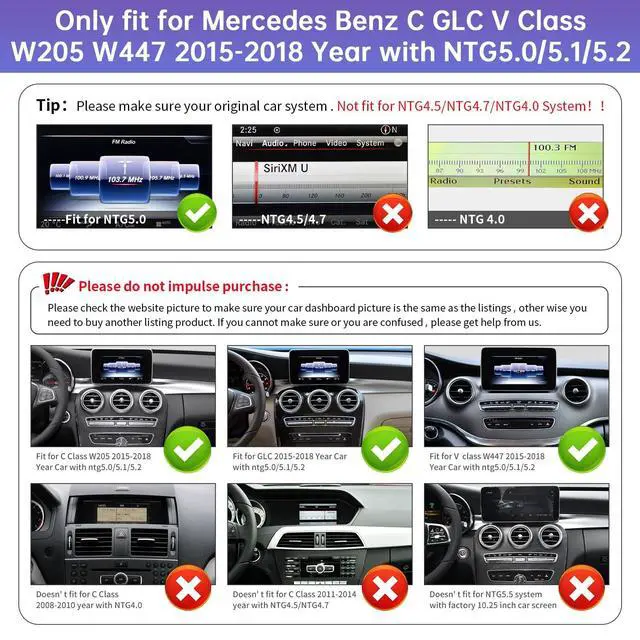 Suitable vehicle: Road Top 10.25 Inch Car Touchscreen fit for Mercedes Benz C GLC V Class W205 W447 2015-2018 Year with NTG 5.0 / 5.1 / 5.2. Please check our website picture to make sure firstly. Such as for Mercedes Benz C180, C200, C250, C300, C350E, C43 AMG, C45 AMG, C63 AMG, C63 AMG S, GLC250, GLC300, GLC350e, GLC43 AMG, GLC63 AMG, GLC250 2015-2018 Year with NTG 5.0 / 5.1 / 5.2 ^^