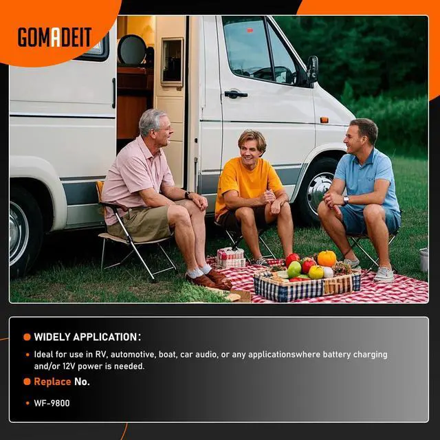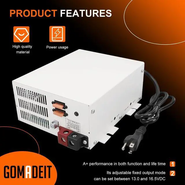GOMADEIT 110 Volt to 12 Volt DC Power Supply Converter Charger Description The GOMADEIT 55 amp rv converters 110Vac power to 12Vdc power to charge a battery and/or power 12V equipment. With our state of the art 3 Stage Smart Charging and adjustable power supply modes, the AC to DC power converter/battery charger are engineered with the user and variable environmental conditions in mind. They will fully charge and maintain any battery type while providing very clean DC Power. Ideal for use in RV, Automotive, Boat, Car Audio, or any applications where battery charging and/or 12V power is needed.