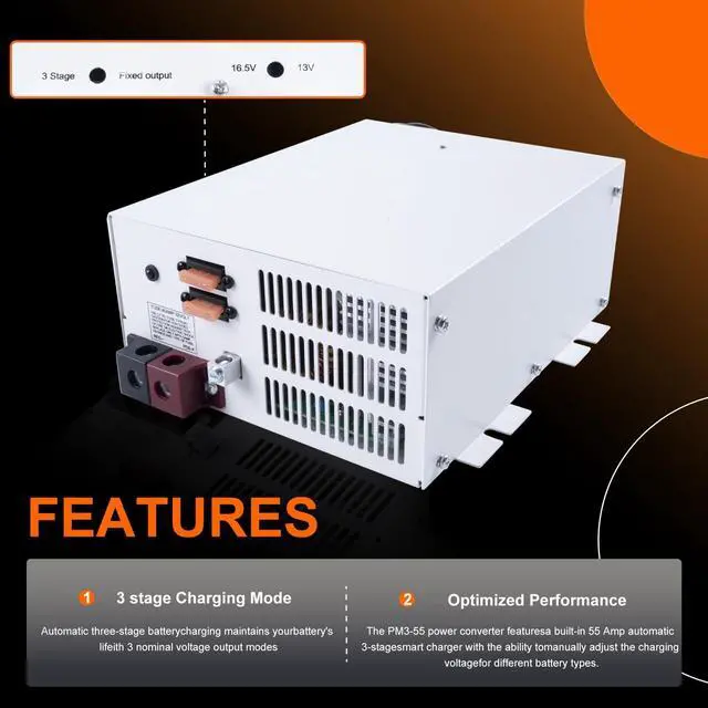 Features Built-in 3 Stage charging and fixed single output modes Fixed output mode voltage can be set between 13.0 Vdc to 16.5 Vdc Quiet fan cooling Reverse Polarity, Overload and Thermal protection