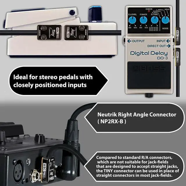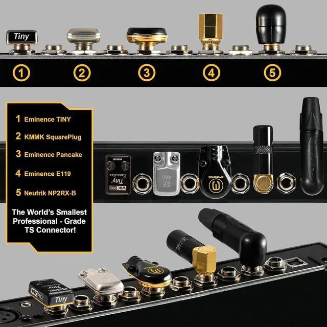 These high-value, high-quality cables will not break your bank and the integrity of your creative process. With WBC-PRO you are buying a product made with love and the utmost care for quality. WBC-PRO, the only cable you will ever need! ^^ The revolutionary Tiny Connector by Eminence, the worlds Lowest-Profile Hybrid-TS plug, combines everything good in Pancake TS, Angled TS and Straight TS plugs. Due to the extreme small size, it will negate the need to use straight TS plugs on most pedal & rack equipment. Technologically advanced finish ensures the plug retains its high-quality appearance even after decades of use.