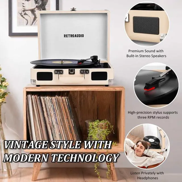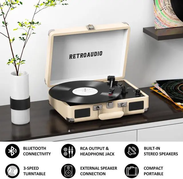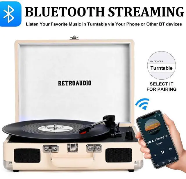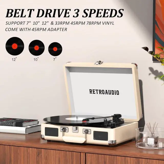 3-Speed and 3 Sizes TurntableSupport 33 1/3, 45, 78RPM and 7", 10", 12" Vinyl. Equipped with a reinforced turntable and sound-isolating feet, it can effectively prevent the vibration caused by playback and restore the most authentic music for you. ^^ Retro Suitcase Record PlayerThe combination of retro elements and modern craft design. Turntable in a vintage suitcase with a convenient carrying handle, allowing you to listen to your music anytime, anywhere, the way you want. ^^ Bluetooth Input PairingEasily Pair and play music from all your favorite devices like iPhone and Android smartphones, tablets through the turntables built in speakers using Bluetooth.