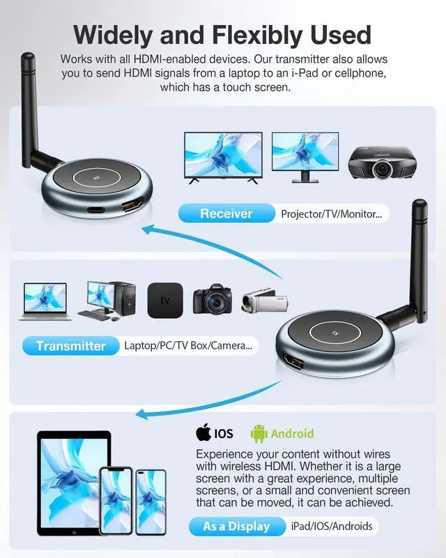 purchased receivers (ASIN: B0CDB69DB7) require initial manual pairing ^^ [ iOS/Android Touchscreen Into a Monitor ]Transform your phone or tablet into a monitor with the TUTUPLAY app. Connect up to 4 devices and mix and match as needed. Please note that touchscreens cannot control the HDMI source in reverse ^^ [ 165FT Long Transmission Range ] Experience perfect transmission up to 165 feet/50 meters in open environments. Even through walls or ceilings with powerful 5.8G technology -covering a distance of 32 FT (10 meters). Easily adjust the wireless channel in the mobile app for optimal performance in crowded Wi-Fi environments