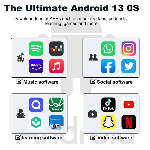 ^^ 144GB Large CapacityOur android MP3 player built in 3GB RAM and 144GB storage(16GB ROM+ 128GB TF card), supports to expand external storage up to 1TB, which can easily hold thousands of music, this can greatly satisfy your need to store more songs, videos, audiobooks. ^^ The Ultimate Android 13 OS Powered by the Android 13 OS and MTK 8-core processor, you can enjoy a seamless user experience, access a vast collection of apps. And it also provides a much better experience in interface and personalization, performance and battery life.