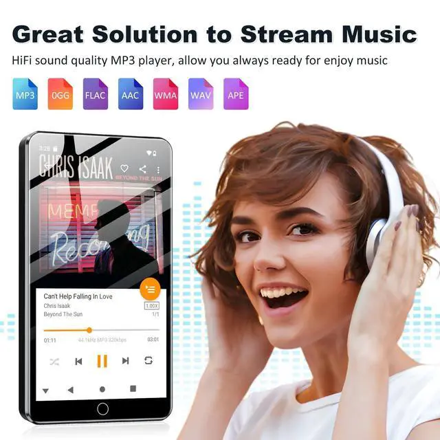 ^^ Great Solution to Stream MusicBuilt-in powerful audio decoding chip and superb circuit optimization technology, which can better convert the source code into the most original sound, providing HIFI-level sound effects close to the original. Compatible with most music formats, including MP3, WAV, FLAC, APE, OGG, M4A, AAC, WMA, etc. ^^ Excellent Visual for 4 MP4 PlayerThis bluetooth MP4 player equipped with the 4" full-touchscreen and HiFi sound module, which make every detail of your favorite movies, videos and photos will be brought to life with crystal clear clarity.