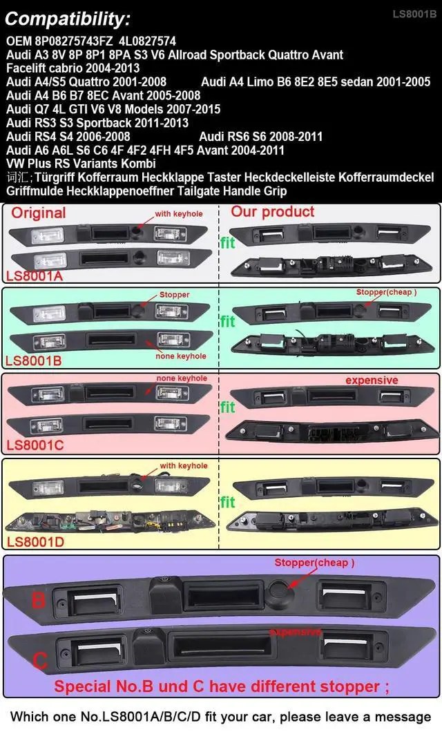 OEM: 8P48275743FZ 4L0827574Replacement for Audi A3 8V 8P 8P1 8PA S3 V6 Allroad Sportback Quattro Avant Facelift cabrio 2004-2013Replacement for Audi A4/S5 Quattro 2001-2008Replacement for Audi A4 Limo B6 8E2 8E5 sedan 2001-2005Replacement for Audi A4 B6 B7 8EC Avant 2005-2008Replacement for Audi A6/S6 Models 2005-2011Replacement for Audi Q7 4L GTI V6 V8 Models 2007-2015Replacement for Audi RS3 S3 Sportback 2011-2013Replacement for Audi RS4 S4 2006-2008Replacement for Audi RS6 S6 2008-2011Replacement for Audi A6 A6L C6 4F 4F2 4FH 4F5 Avant 2004-2011Replacement for