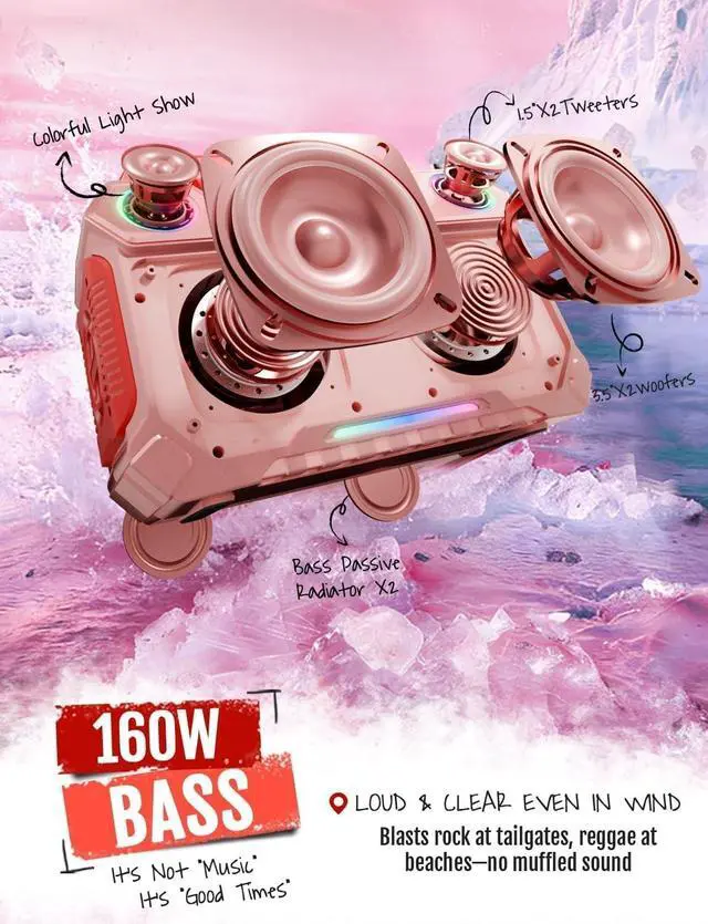 • 160W MASSIVE BASS: Featuring 2 dedicated bass drivers and 2 tweeters, this loud bluetooth speaker emitting crisp treble, resonant bass and balanced midrange.