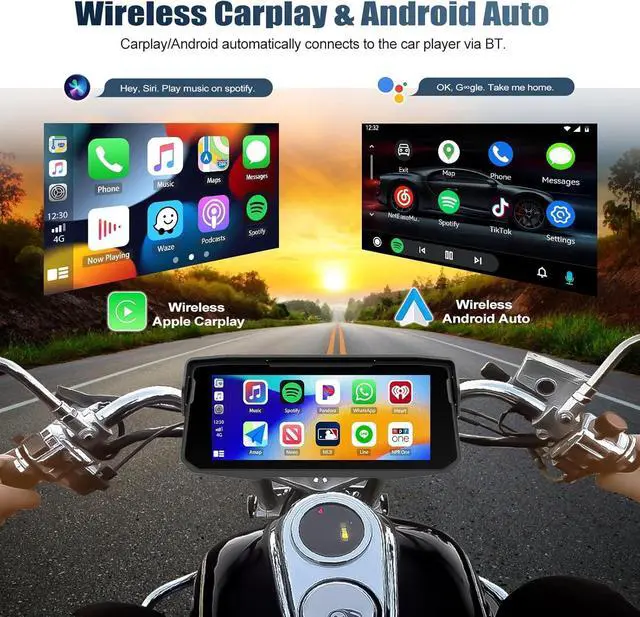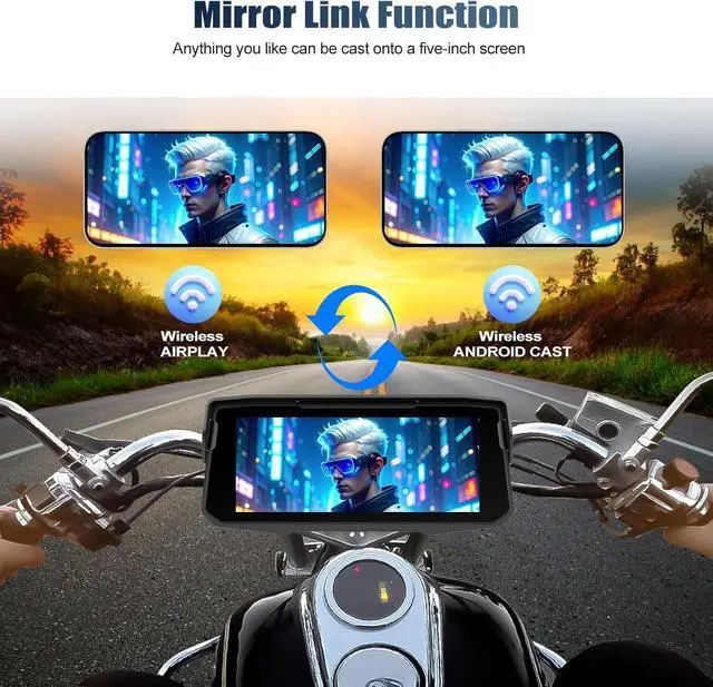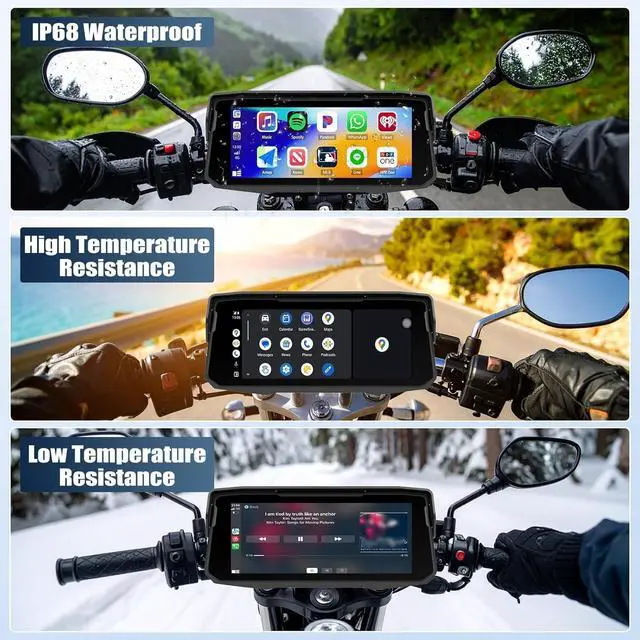 [VIVID LARGE SCREEN & WIRELESS FREEDOM] - Unlock a smarter ride with this 6.86 -inch high-definition motorcycle display screen. Enjoy seamless wireless CarPlay and wireless Android Auto connectivity, along with wireless AirPlay and Android cast, for full smartphone integration. The crisp 1280*480 resolution ensures every map detail and media file is brilliantly clear, transforming it into your ultimate motorcycle GPS navigation and entertainment hub ^^ [RUGGED IP68 WATERPROOF DESIGN] - Built to withstand the elements, this waterproof motorcycle screen boasts an IP68 rating. Ride with confidence in rain or shine, knowing your smart display for motorcycle is fully protected against dust and water, ensuring reliable performance on every adventure ^^ [PERSONALIZED & FEATURE-PACKED] - Customize your experience with 4 switchable screen backgrounds.