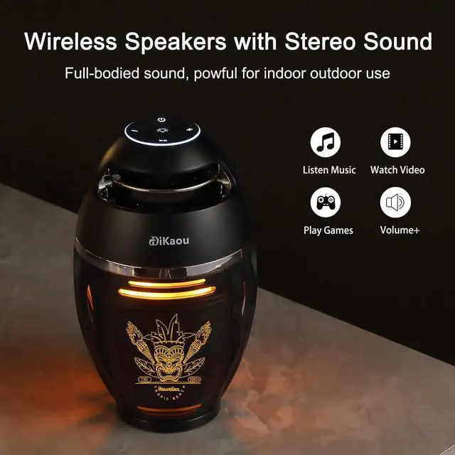 The Tiki patterns and tropical style patterns each occupy about a quarter of the product's appearance. Buy 1 wireless speaker, you will like get 3 different flame speaker at the same time. ^^ Dual Sync TWS Connection TWS function lets you pair two speakers for a powerful 10W true stereo surround sound. The unique wireless speakers is the perfect gift for Christmas, Birthdays, Father's Day, Thanksgiving Day, and other Holidays for men, dad, boyfriend, brother, or women. DIKAOU Tiki torch Indoor/Outdoor speakers deliver rich, room-filling stereo sound.
