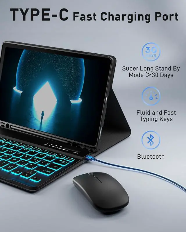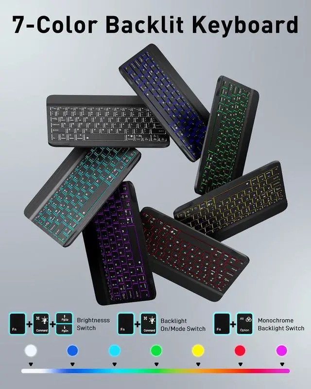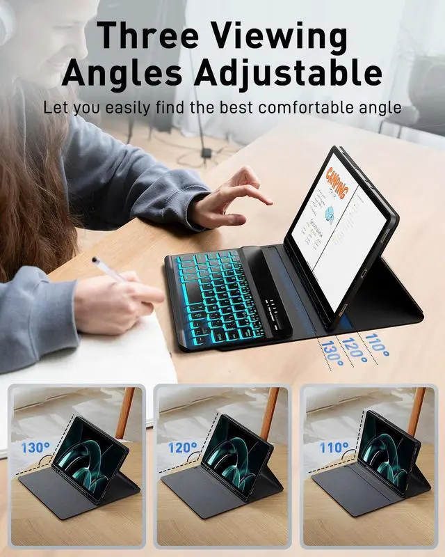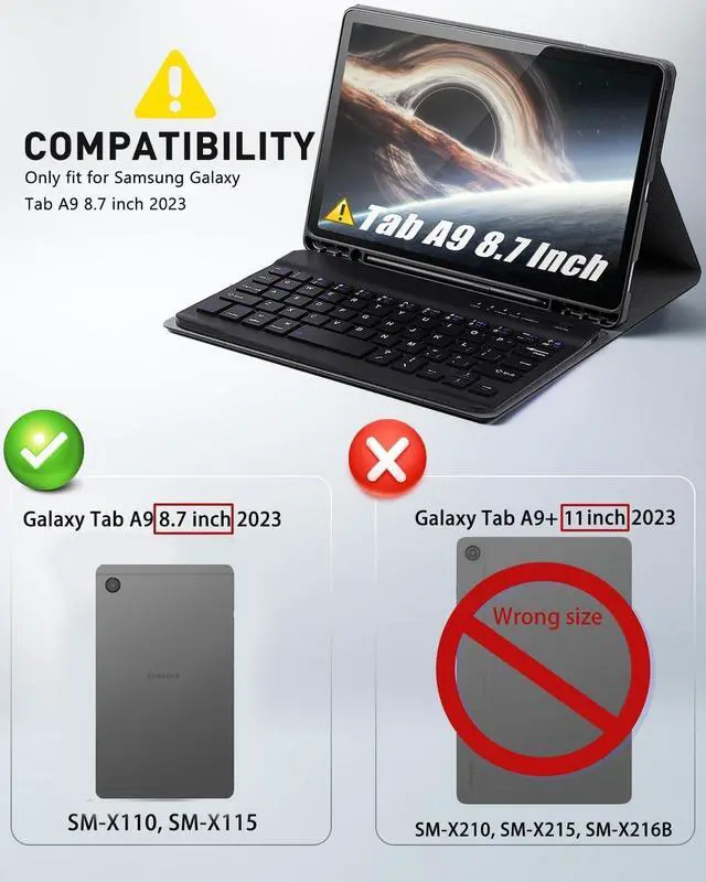 Model CompatibilityDesigned Only for Samsung Galaxy Tab A9-2023 8.7 -inch SM-X110/SM-X115, Not compatible with other models. You can check the model number before purchasing to make sure you get the correct size tablet keyboard case. ^^ Magnetically Detachable Backlit KeyboardCase for Samsung Galaxy Tab A9-2023 8.7 -inch SM-X110/SM-X115 comes with a detachable magnetic keyboard. The ultra-thin and lightweight magnetic keyboard can be firmly attached to the case, which helps the tablet stand upright and turn it into a mini laptop in less than a second. Use the optional backlight mode to choose your favorite color from 7 colors for smooth typing in the dark, even when working at night.