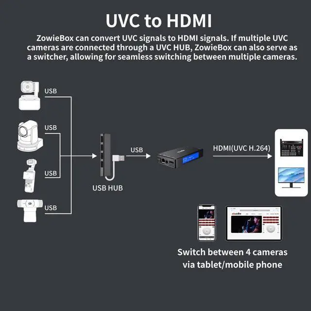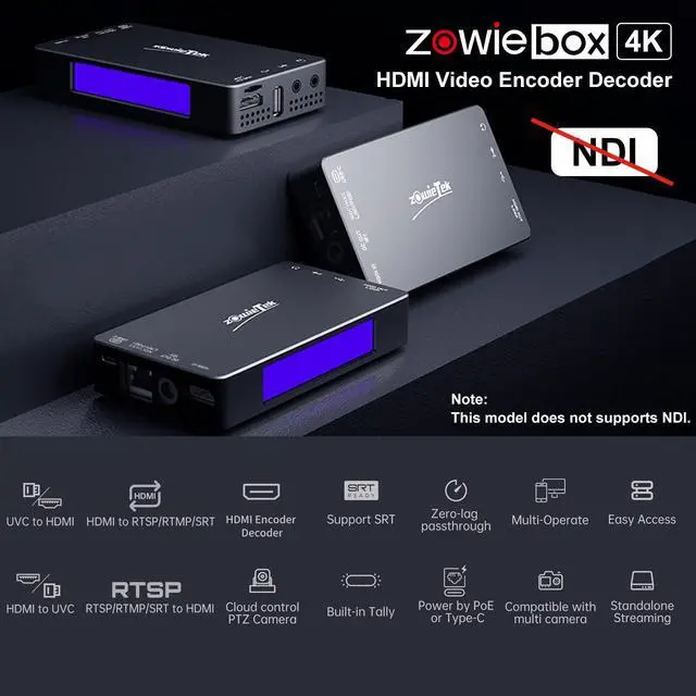 ^^ Compact but Powerful: ZowieBox, smaller than phones, with a tally light and LCD screen showing streaming status, can stream and record console gameplays at 4K capture with zero-lag passthrough. The IP stream can be decoded into a 4K HDMI signal.