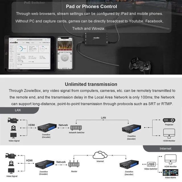 ^^ SRT/HDMI Encoder Decoder: SRT (Secure Reliable Transport) ensures secure, low-latency, and reliable video transmission over unstable networks. ZowieBox allows seamless conversion between HDMI and SRT, enabling smooth, high-quality broadcasts, live streaming, and secure video delivery in any network environment.