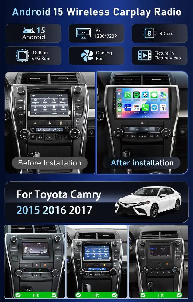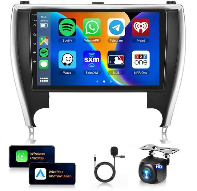 10-Inch with Snapdragon 8-Core 4+64GBFor Toyota Camry 2015-2017 Car Stereo Experience the pinnacle of in-car entertainment with HD IPS touchscreen car stereo, powered by a robust 8-core processor and featuring 4GB RAM+64GB ROM. Android touch screen car stereo with resolution of 1280*720, while the scratch-resistant, Anki-knock, and high-temperature protection ensure durability. Enjoy a wide color gamut with Display P3/SRGB ^^ Wireless Carplay/Android AutoFor Toyota Camry carplay double din dash kit supports wireless Car Play/Android Auto/Mirror link connect, while WIFI and Bluetooth 5.1 ensure swift and stable connections, project the contents of your phone to the large car screen of the Toyota Camry car radio, and you can share your favorite videos, pictures, etc.