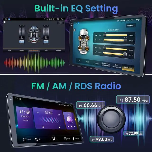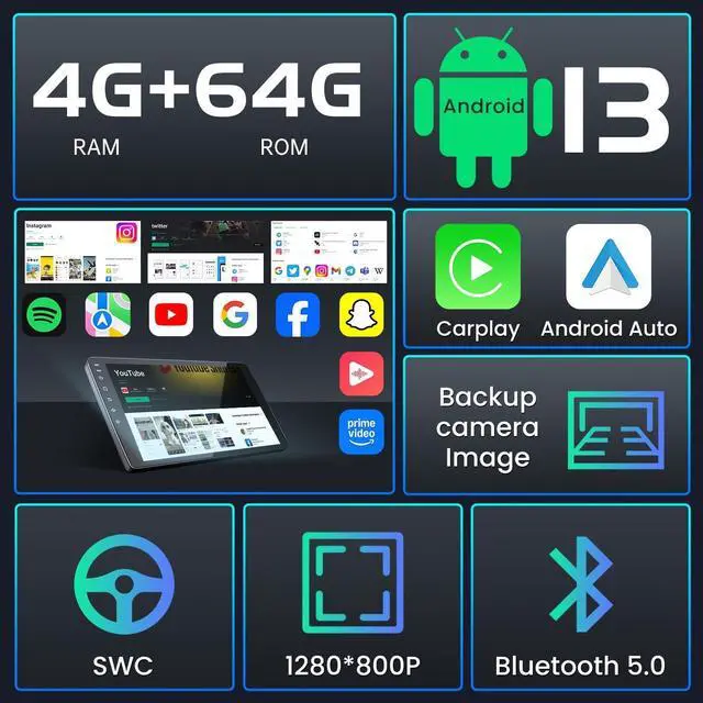 64G means you can finally chill about storage anxiety ^^ CarPlay & Android AutoCompatible with CarPlay/Android Auto. Whether it's through a wireless Bluetooth connection or a USB link, while Siri or Google Assistant step in as your trusty co-pilots for hands-free calls and smooth access to music, browse maps, notifications and messages. Free your hands for safer driving ^^ WiFi, Bluetooth5 & GPSCar radio supports WIFI and Mobile Hot-spots. You use navigation & apps live online, or download offline maps + top apps ahead of time (all quick and easy). Upgraded Bluetooth 5.0 + dual mics (built-in & external) deliver crystal-clear calls with advanced noise reduction, plus rock-solid connectivity and 2x faster data transfer.