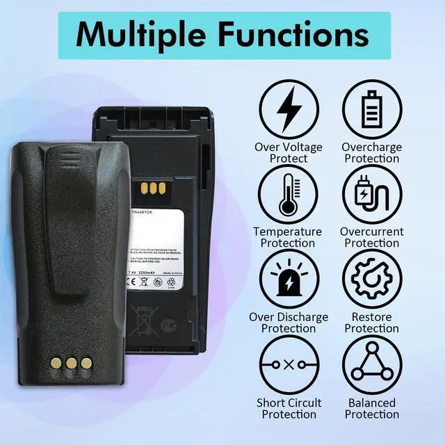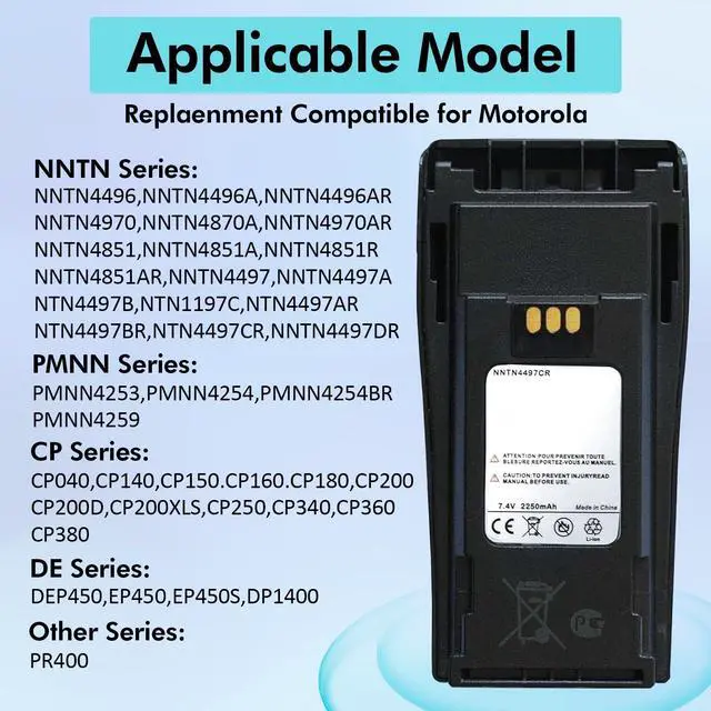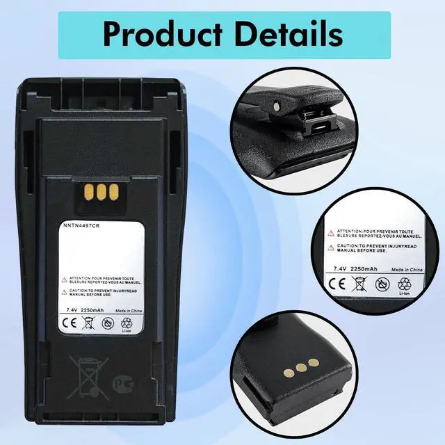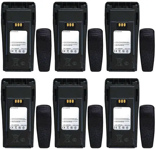 : Battery Type: Li-ionCapacity: 2250mAhVoltage: 7.4VC ompatible Models: CP040, CP200, PR400, GP3188, EP450, DEP450, GP3688, and more. Package Includes: 6 x NNTN4497CR 7.4V 2250mAh Li-ion Batteries6 x Belt Clips