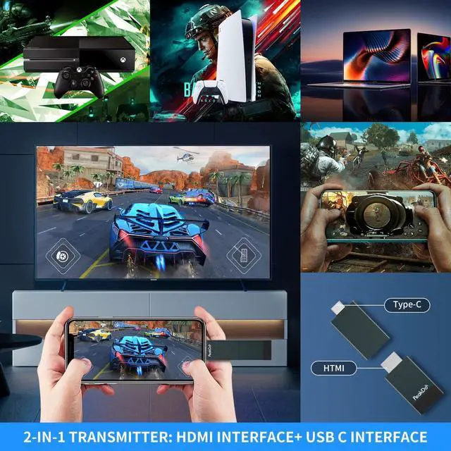 Play: The wireless hdmi transmitter and receiver is easy to set up. Just plug the transmitter into the signal source device with HDMI or USB C interface (laptop, PC, phone, Switch, PS5, PS4, Steam Deck, ROG Ally, Xbox ) and plug the receiver into TV, monitor, or projector, no software or Wifi connection required. Eliminating the need to install expensive, inconvenient cables