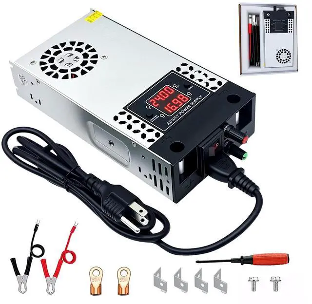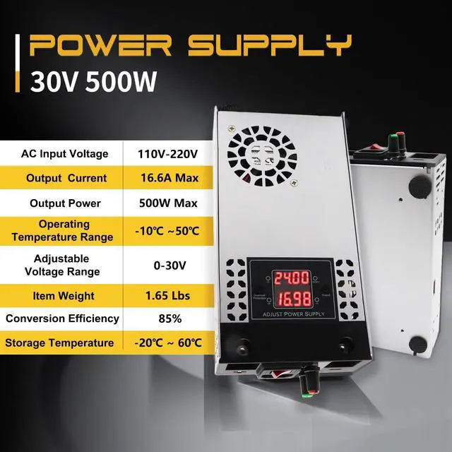 Upgrade Adjustable 0-30V power supply: Input voltage AC 110V/230V, output voltage DC 0-30V, rated power 0- 16.6A mp 500W. This is the latest model of adjustable and displayable DC power supply, which can display both voltage and current.