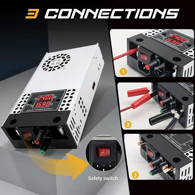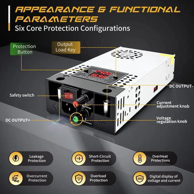 ^^ Intelligent cooling system: The adjustable 0-30V 0- 16.6A 500W power supply equipped with multiple cooling holes, built-in fan and dustproof mesh, effectively prevent dust intrusion, ensure stable fan rotation and prevent circuit board burning.