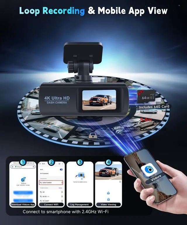 ^^ Loop Recording/G-Sensor: The dash cam will automatically overwrite the content when the memory is full. At the same time, the car dash cam has a built-in gravity sensor. If there is a sudden movement or collision, it will automatically lock and protect the relevant recording to ensure that it will not be overwritten during loop recording. ^^ HD Night Vision/64GB TF CardThis dashcam provides excellent night vision even in low-light conditions, ensuring clear footage even in rain, snow or at night, capturing every detail for you. At the same time, it comes with a 64GB TF card, so you don't need to buy it separately, just plug and play ^^