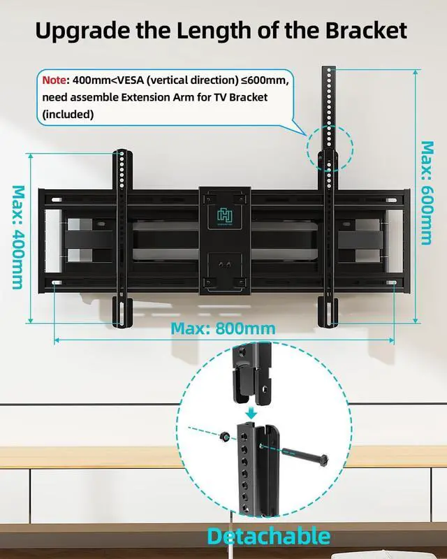 Adjustable Mounting Bars: This mount is fully compatible with VESA patterns up to 800x600, ensuring a secure fit for a variety of TVs. The removable mounting bars allow you to adjust from 400mm to 600mm, offering flexibility for different TV sizes.