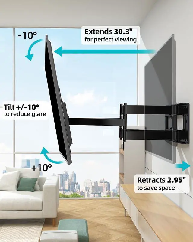 Inch Extension: The 30.3 inch long arms allow you to extend your TV further from the wall, giving you enhanced flexibility to adjust the viewing position. Tilt the screen from +10 to -10 and adjust horizontally by +/-3 for the perfect angle. ^^
