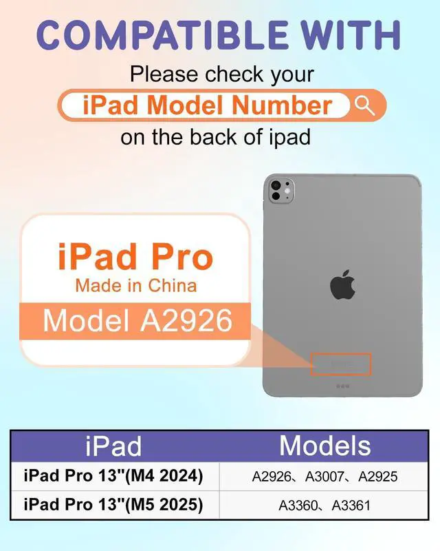 Compatibility: Please check your tablet model before purchase! This case is designed specifically for iPad Pro M4/M5 13 inch 2024/2025. To find your model, check the back or settings of your tablet. Avoid frustration and ensure a perfect fit ^^ 360