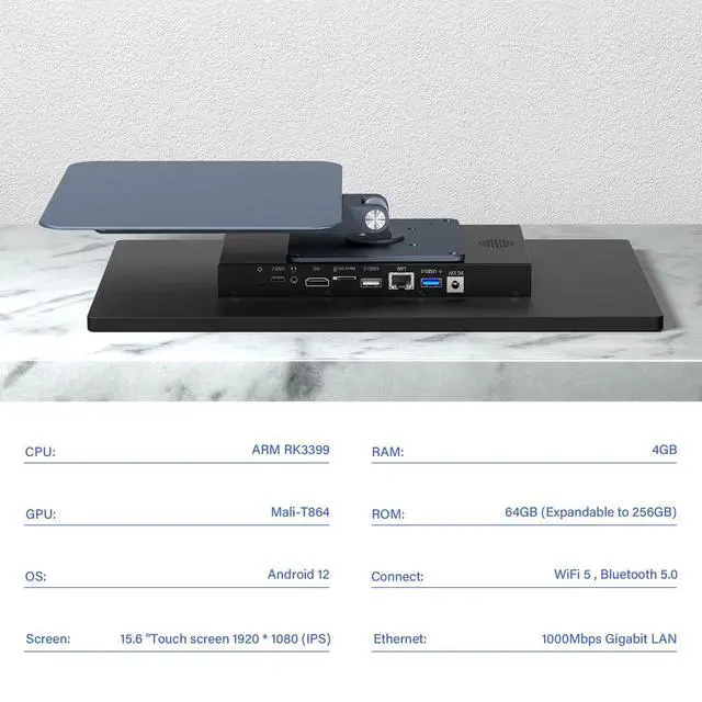 15.6 Inch HD touch screenOuuOee 15.6 inch touchscreen computer with G+G 10 multi-touch screen resolution 1920*1080 (IPS ), can be used without mouse and keyboard. This multifunctional touchscreen mini pc eliminates the clutter of cables and traditional peripherals from taking up desktop space. It helps you open up a new and efficient office experience with a more intuitive and smooth interaction ^^ High-Speed Performance and Expandable StorageThis All-in-One desktop pc equipped with ARM RK3399 processor, enjoy faster computing with 4GB of LPDDR4x RAM and 64GB of storage. Expand storage effortlessly with a Micro SD card slot ^^ Free spinning screen & flexible foldingOuuOee tablet computer with a 360 all-round screen rotation, allowing for easy switching between landscape viewing, portrait browsing, and multi angle sharing and display, The 180 folding bracket provides convenient storage, stable support during use, and lightweight folding for easy space saving, allowing desktop computers to be easily accessed ^^ Rich input/output portsThe Industrial pc all important connections are available, power ports * 1, HDMI 2.0 ports * 1, USB 3.0 ports * 1, USB 2.0 ports * 1, USB-C ports * 1, 1000Mbps Gigabit LAN ports * 1, TF card socket * 1, DC and 3.5 mm Audio ports * 1.
