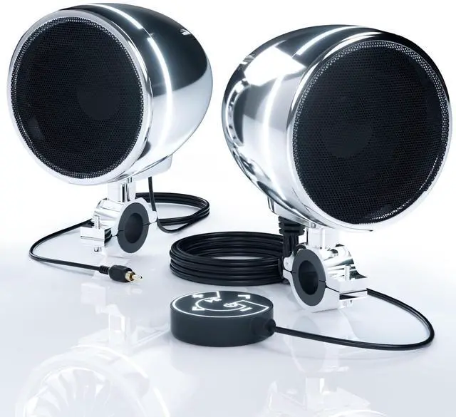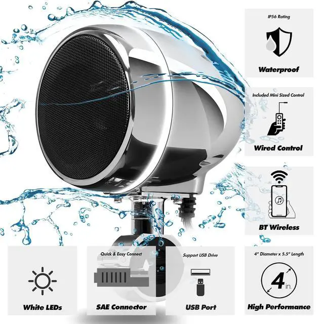 Speaker System: AN4-Halo LED All-in-One Amplifier 2-Channel 4 Full Range Motorcycle Stereo Speakers with High-Performance Bass. 300W Class-D Electronic Amplifier Built-in. No Additional Amplifier is Required. Bluetooth, USB and 3.5 mm AUX IN Available. ^^ 4" Chrome Finished Speaker Housing with Mesh Screen and White LED Ring. Turn On and Off the LED Simply by Long-Press the Play Button. Waterproof Design. Built with High-Quality ABS Material. 70" Long Speaker Cable (Slave speaker) with Standard RCA Male Connector(Can be extended, Search for RCA Extension, Sold Separately). ^^ 3.5 mm AUX and USB Input Available. Support USB drive only. (Does not support USB to Phone as music playback. USB Charging is not supported. ) Included Full-Function Backlit Wired Control to Navigate the System Functions at Ease. Superb Crystal Sound Quality. Advanced IP56 Waterproof Design. Included Mounting Clamp supports 7/8" to 1-1/4" bar size. ^^ Bluetooth 5.0. Wirelessly Stream Your Favorite Music and Radio Channels From Your Smartphone with Superb Crystal Sound Quality. Compatible with iPhone Pro Max, iPod, iPad, Samsung Android Galaxy S A M Z Series and Any Smartphone Devices.