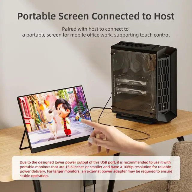 ^^ Note: Due to the limited power output of the USB-A port on this cable, it supports portable monitors up to 1080P resolution and under 15.6 inches in size. For portable monitors larger than 15.6 inches, an additional power cable connection is required. When using the USB cable connected to a computers USB port to power a portable monitor, please ensure the computers USB port provides sufficient current. Since AR glasses require less power, if adequate current is available, the USB cable can be connected to a power bank or external charger to supply power to the AR glasses.