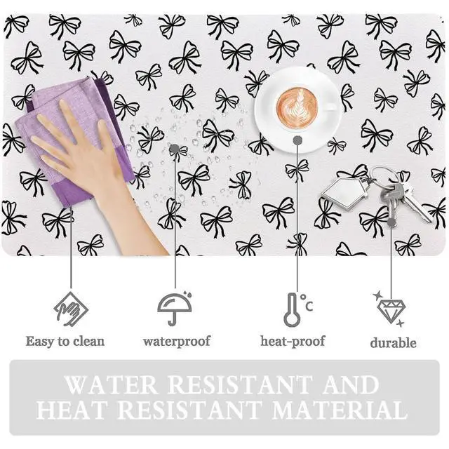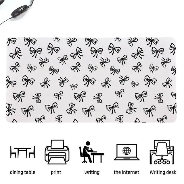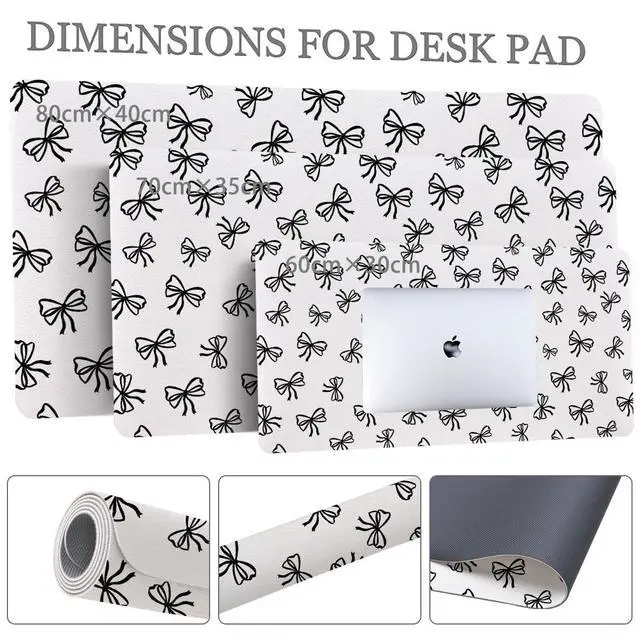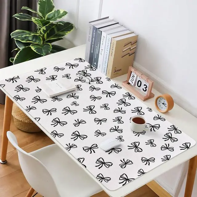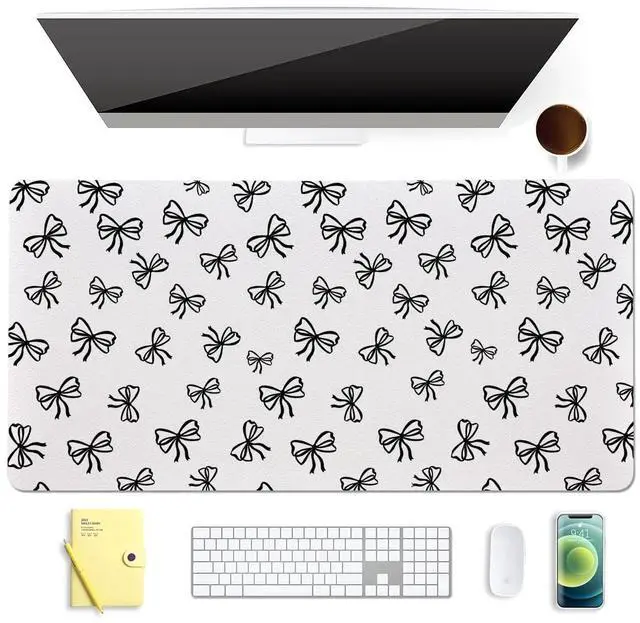 Package included: a 80 x 40 cm ( 31.5 15.7 inch) leather office home desk mat. This mouse pad is large enough to accommodate your laptop, keyboard, mouse and other desk items ^^ This desk pad made of durable PU leather, help prevent your desk from damages such as scratches, stains, spills and heat. And it is easy to clean, just wipe with a wet cloth or tissue ^^ No-slip particle design for back side increase friction resistance with the desktop. Smooth surface allows fast mouse movement while maintaining excellent accuracy and control ^^ This office home desk mat design with exquisite exclusive design patterns, it can decorate your home and office environment ^^ Unique cute kawaii black bow white leather desk mat design, it is a very creative and practical present for friends and family