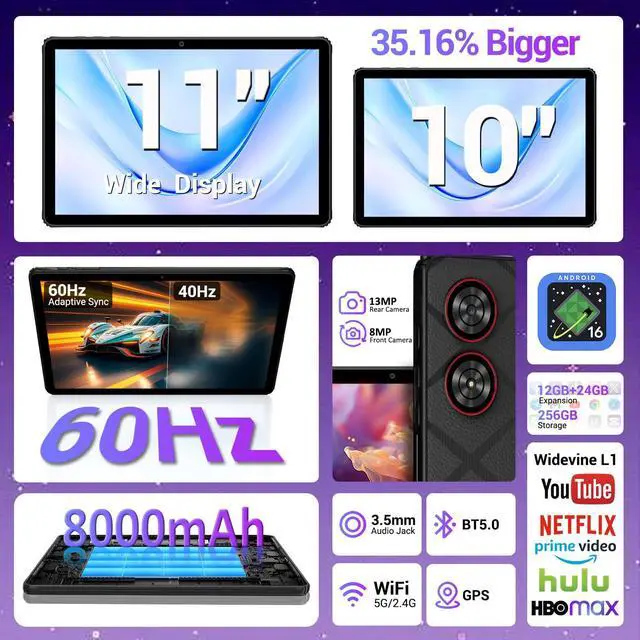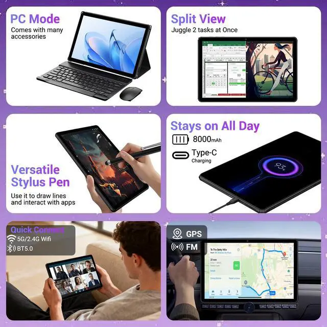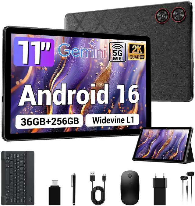 Its straight bezel and durable material offer a premium, fashionable look that's also tough for daily use. This 11 inch tablet is the perfect companion for adults and students who need reliability on the go. ^^ Complete Productivity & Creativity Suite This isn't just a tablet; it's a versatile workstation. The included 3-in-1 keyboard, mouse, and stylus case transforms it instantly, offering a true PC experience. Use the stylus for notes or art, and leverage split screen function to browse and write simultaneously. With 5G/ 2.4G Dual WiFi, Bluetooth 5.0, and 2K wireless projection, connectivity is seamless.