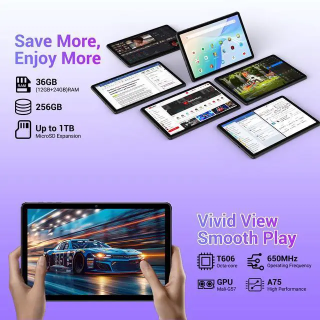 Vivid Display, Immersive Entertainment Experience stunning clarity on this 11 inch tablet featuring a 2000x1200 2K tablet display with IPS technology and a 16:10 golden ratio. The In-cell screen with 84.9 % screen-to-body ratio and 178 wide-viewing angle offers vibrant visuals from any position. Combined with dual BOX cavity speakers, it's perfect for watching movies or casual gaming. The high-brightness screen with G+G glazing and blue light protection ensures your viewing is always comfortable and premium, making it a top-tier android tablet for adults. ^^ Robust Performance for Demanding Tasks Powered by the octa-core CPU and Mali-G57 GPU, this Android 16 tablet delivers smooth, no-lag performance ideal for gaming, business, and multitasking.