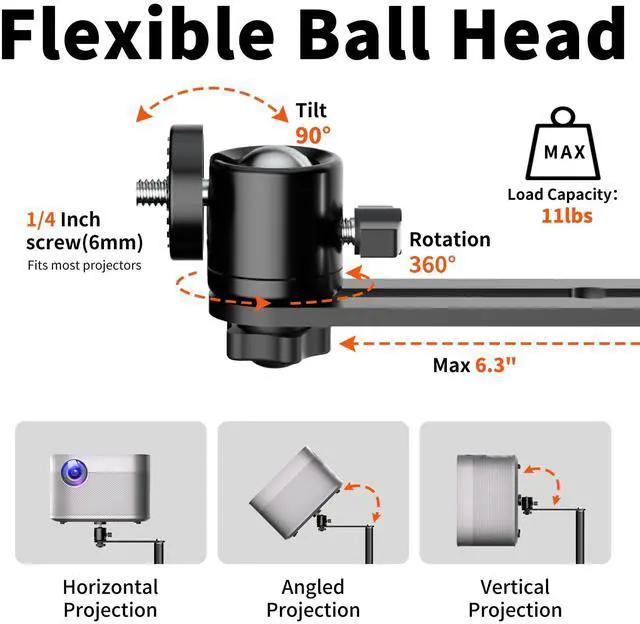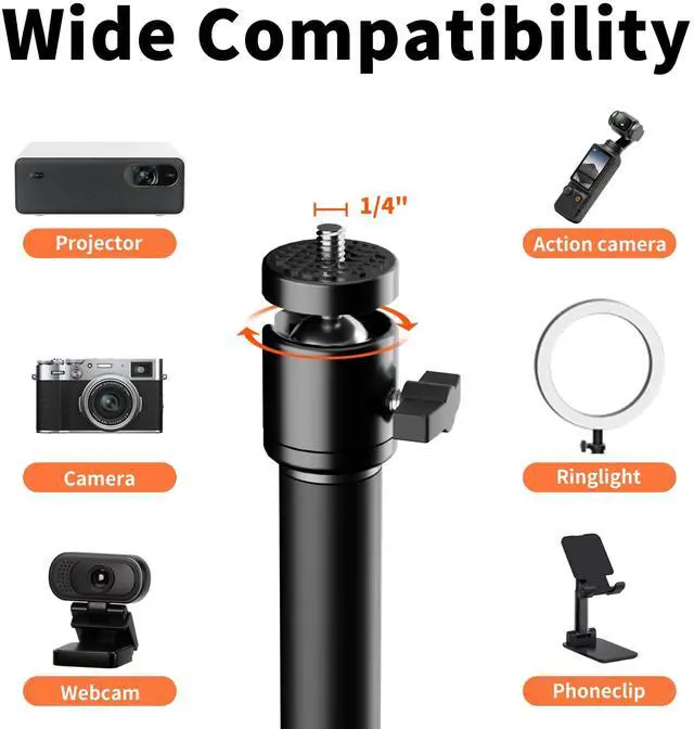 WIDE COMPATIBILITY: Equipped with a standard 1/4-inch screw head mount for various equipment like projectors, cameras, webcam, phone clamps, ringlight and others.