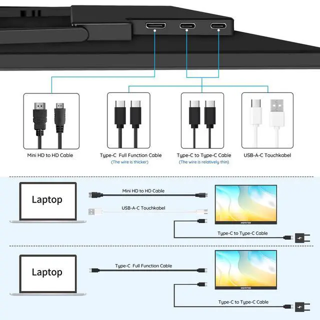 MUST NOTE: For Type-C 3.1 DP ALT-MODE or Thunderbolt 3/4 ports, use USB-C to USB-C cable for power, video, and touch. Use HDMI+USB-C for devices without these ports. No extra drivers required ^^ Wide Compatibility - the laptop screen extender features 2 full-featured Type-C ports and 1 HDMI port, providing versatile connectivity options. One Full- Type-C Cable is required to connect to the power supply & display signal transmission. You can connect it to a variety of devices, including laptops, desktops, gaming consoles, and mobile phones.