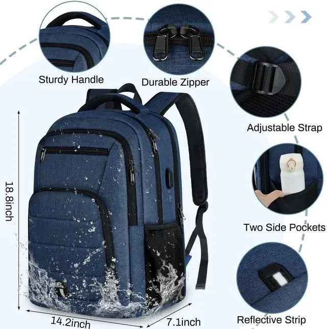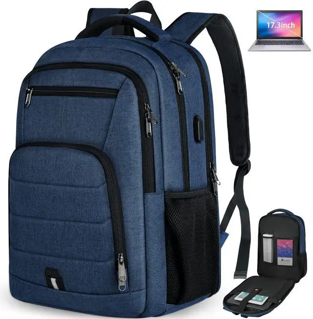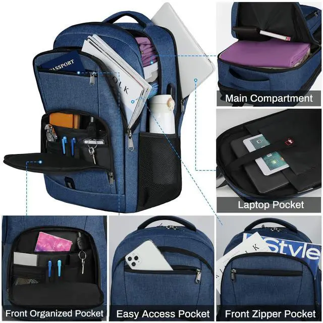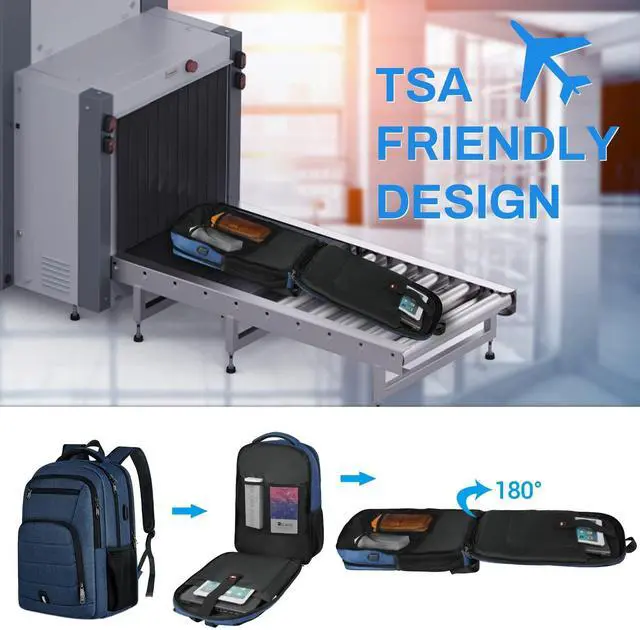 LARGE CAPACITY & SPACIOUS POCKETSThis laptop backpack for men has lots of pockets for well organization. One separate laptop compartment can fit a laptop up to 17.3 inch. One main packing compartment roomy for daily essentials and tech electronics accessories. 1 organized compartment with hidden pockets and pen pockets. 2 side mesh pockets. 2 front zipper pockets. 1 back anti-theft pocket. ^^ USB CHARGING PORT & TSA FRIENDLYExternal USB port with built-in charging cable offers a convenient way to charge your cellphone while walking. Designed exclusively for airplane flight travel, the travel backpack can be opened up to 180 degrees for scanning easily, making it getting through airport security checkpoint more quickly.