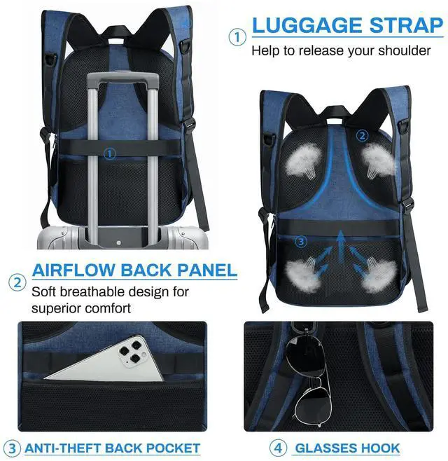 ^^ COMFORTABLE & PRACTICALDurable back pack with soft & padded back, adjustable breathable mesh shoulder straps, which help to relieve the stress from your shoulder. Both shoulder strap with lanyard design, can hang sunglasses and other small items. 1 back luggage strap allows this computer backpack slide over suitcase tube for easier carrying. The front reflective strip of the laptop backpacks makes it safe to travel at night. ^^ WATERPROOF & DURABLE MATERIAL17 inch mens backpacks is made of water-resistant and scratch-resistant polyester fabric, which protects your inner items from getting wet on drizzle days.