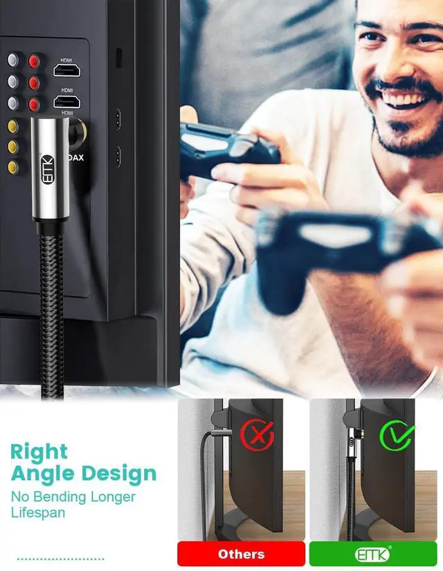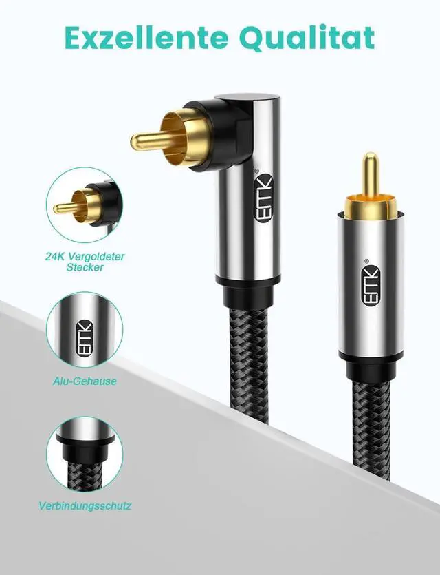 [Space-Saving Right Angle Design] The innovative right-angle design of this cable is perfect for wall-mounted devices, making it easy to connect in tight spaces. The 90-degree connector prevents cable bending, extending its lifespan. This design allows for quicker and easier connections compared to standard RCA cables. ^^ [Exceptional Audio Performance] This 90-degree subwoofer cable is designed with high-quality, corrosion-resistant gold-plated RCA connectors and a polished alloy housing. It delivers clear, precise stereo audio with optimal conductivity. The cable's dual shielding, featuring copper braid and aluminum foil, ensures maximum signal strength with minimal loss and protects against RFI and EMI interference.